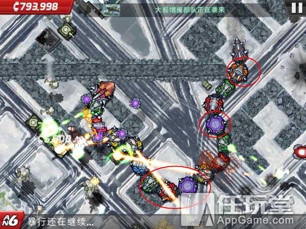 巨兽在战场上会自动破坏城市,对敌人进行反击。每次摧毁敌方武装,巨兽都能得到红、黄、蓝三色能量块(不摧毁就没有)——这里就是游戏的好玩所在,你得把能量块合理地拼到巨兽身上,使它越来越长,越来越大。