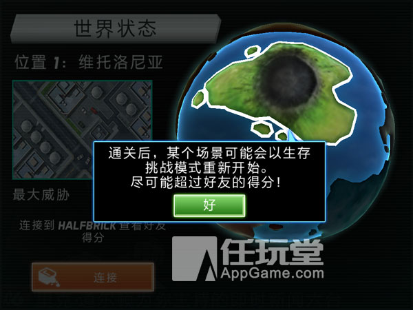 游戏的章节很多,每章一个场景,每个场景有若干城市,玩家必须逐一攻破这些城市才能通过本章,解锁下一个场景。而已经打通的那些章节会以“生存挑战模式”的形式出现,供玩家战斗赚钱捡道具,或者连上HALFBRICK跟朋友拼得分(反正小A是这么干的)。
