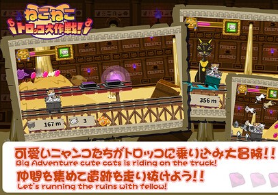 可爱的喵星人将乘坐矿车在遗迹中探险,玩法非常简单,玩家只需要躲过障碍物、尽量多的获取道具就可以了,在酷跑的过程中,会有越来越多的喵星人乘上矿车,要小心不要把它们给甩下来哦!