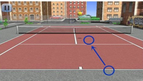 游戏中最容易得分的情况就是往对方的边角击球。如图所示,看到球往玩家这边的角落飞来的时候,玩家手指按照两个圆圈之间的箭头滑动,就能按照蓝色箭头的轨迹将球打向对方的角落。这样对手是很难接到球的,玩家就可以得分了。