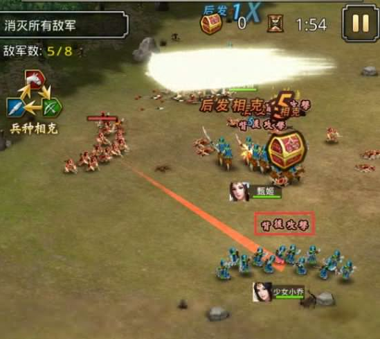 后发制人发动时,有一定几率获得宝箱,宝箱可以开出各式各样的道具。战斗中,合理利用机动部队从背后袭击敌军,或者利用防御部队吸引获利为远程部队创造机会背后攻击,都能够给予敌军部队造成巨大的伤害,各位主公合理的配置兵种,给予敌人致命一击吧~