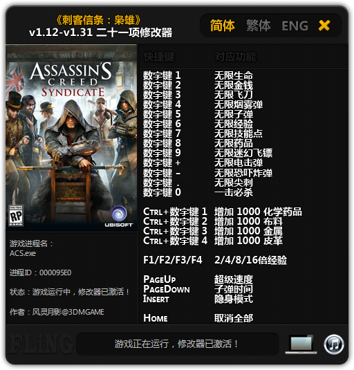 刺客信条枭雄二十一项全版本修改器由3DM风灵月影制作,该修改器支持无限生命、无限金钱、无限飞刀、无限子弹、无限药品、无限电击弹、无限恐吓炸弹、无限尖刺、一击必杀等多达二十一项修改功能,辅助支持简中、繁中、英文三种语言版本,喜欢玩刺客信条枭雄的朋友可以来试试这款风灵月影修改器。