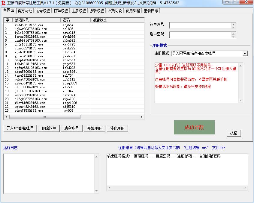 卫推百度账号注册机专为百度用户量身定制,它可以帮助你全自动批量注册申请百度账号,支持自动导入新浪邮箱、网易163邮箱后再注册百度账号,支持宽带拨号同时支持动态vps宽带拨号,支持云速远程打码,支持手机验证码远程打码,手动打码,注册结果自动写出到软件所在文件夹下的"注册结果.txt" 记事本文件中。