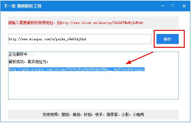 下一发视频解析工具是一款免费好用的视频地址解析下载工具,这款软件可以帮助对网上的一些短视频进行下载地址解析,解析完成复制链接地址即可通过迅雷等下载工具完成下载,目前支持秒怕、微拍、美拍、快手、小影、微录客、小咖秀等视频解析和下载,欢迎喜欢的朋友免费下载使用!