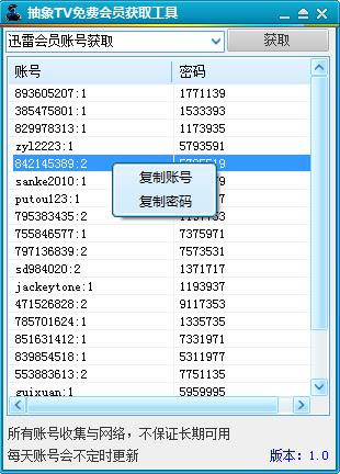 抽象TV免费会员获取工具是一款2016年最新的免费影视会员VIP账号获取器,这款软件可以帮助用户免费一键批量获取迅雷会员、爱奇艺会员和优酷会员账号,每天实时更新,软件没什么好介绍的,操作很简单,大家下下来就知道怎么用了。