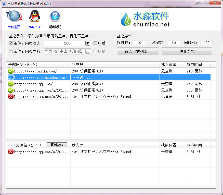 水淼网站状态监控助手是一款由水淼软件官方推出的网站监控软件,这款软件可以帮助你实时监控网站的运行状况,以免出现无法正常访问等异常情况,这款水淼网站状态监控助手可以大批量地全天候动态监控网站的动态,可监控任何网址或者内页,出现异常及时反馈并列出来。