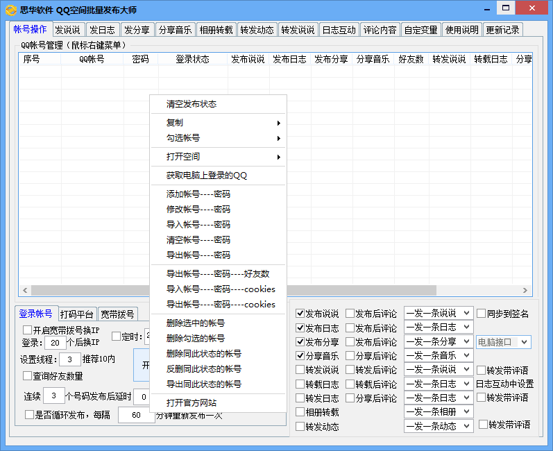思华QQ空间批量发布大师是一款由思华软件官方推出的2016年最新QQ空间批量转发评论工具,这款软件可以帮助广大QQ空间用户批量登陆QQ发说说,批量转发日志说说、批量评论、批量分享、带图片转发等等,亲自测试可用,某宝卖几十呢,需要的朋友快来免费下载使用吧!