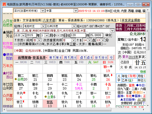 从公元前2701年到公元7360年共10060年,含有儒略日、年代纪元、干支、日月食、节气交节时刻、星座、各种节日(包括九九、三伏、梅雨)等,同时加入了每日吉兇等等。本程式我还会进一步改正,让它更完善!