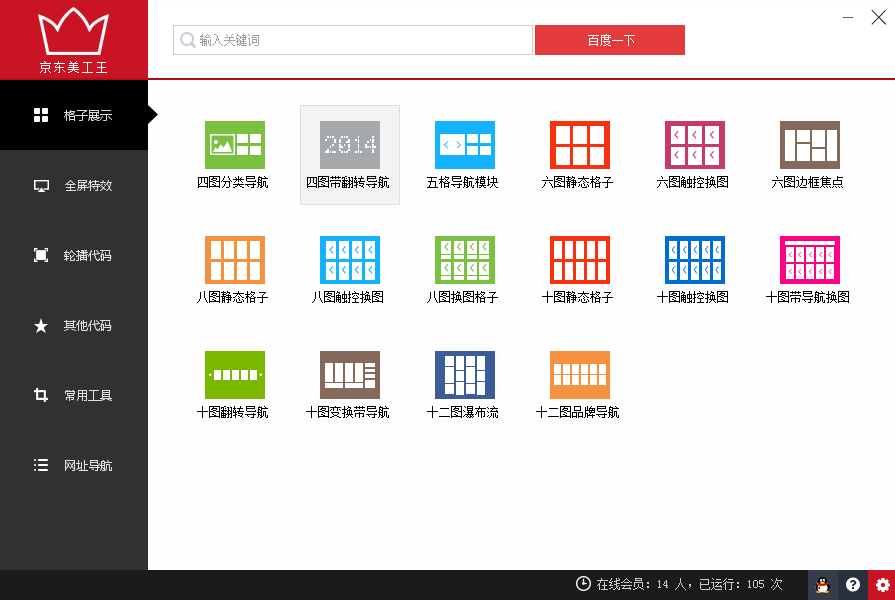 京东美工王是一款基于京东商城的京东店铺装修专用软件,在店铺装修生成专用的特效代码,能生成京东装修市场常见的Css+Js特效模块代码。本软件是一款绿色软件,无需安装,也不会在京东美工王文件夹外保存任何数据。一切京东美工王的数据都保存在京东美工王目录下,如需卸载,只需直接删除京东美工王目录即可。