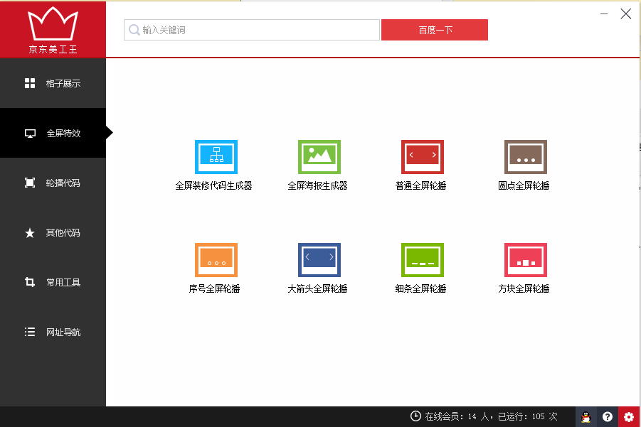 1、软件能生成全屏装修代码、固定背景代码、全屏海报、反暗亮模块、悬停切图、卡盘轮播、缩略图轮播、滚动轮播、底部卡盘轮播、右侧卡盘轮播、多图格子轮播、多图宝贝秀、方块导航轮播、等近百种特效代码。