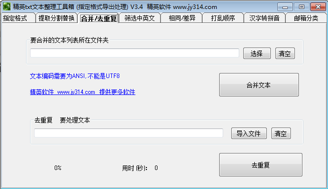 精英txt文本整理工具箱是个多功能的综合文本管理工具,提供了多个文本操作的功能,分割提取替换,合并去重复,筛选中英文,打乱文本顺序,汉字转拼音,邮箱分类等等,可以将各类常用的数据保存到文本里面,使用这款文本整理工具箱进行不同需求的操作,方便实用,能够大大提高你的整理效率。