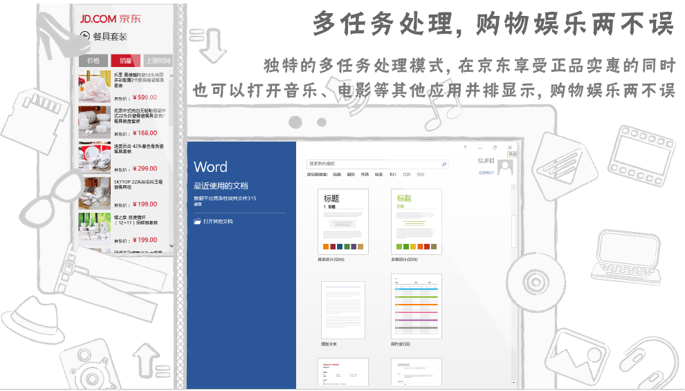 独特的多任务处理模式,在京东享受正品实惠的同时也可以打开音乐、电影等其他应用并排显示,购物娱乐两不误!