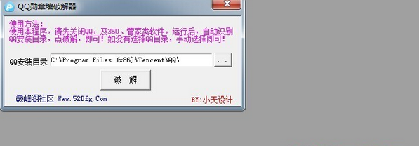 1、运行补丁,自动识别QQ安装目录,点破解,即可!(如没有选择QQ目录,手动选择)