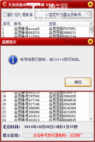2、获取到账号之后,在账号列表任意双击一个账号,就会弹出复制信息,提示帐号信息已经复制,按Ctrl+V即可粘贴