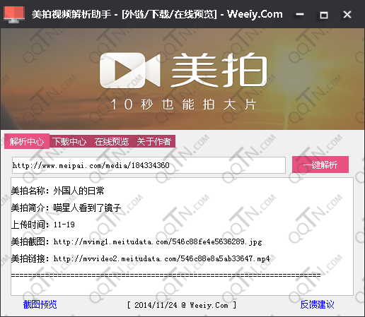 在编辑框中填入你需要解析的美拍链接,即可获得:视频名称;视频简介,视频图片截图,视频上传时间,视频下载外链地址