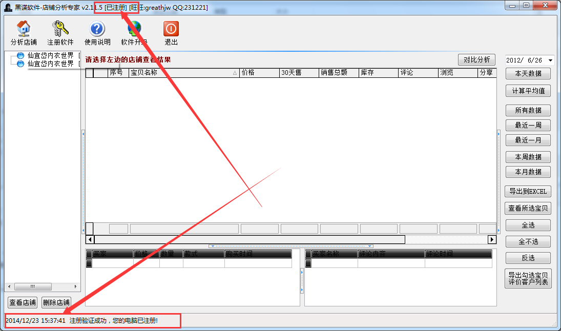 3、读完数据后,关闭读数据小窗口,回到主界面,此时您可以按软件列有的功能查看该卖家的营业状况了.