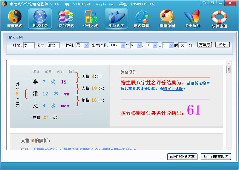 3、 软件独有的专业生辰八字分析功能,可以对宝宝的生辰八字五行用神进行综合判断后,为宝宝量身打造一个财官运俱佳的高分好名。生辰八字取名是本软件特色功能,宝宝的生辰八字和名字的完美配合才是起名的重点。
