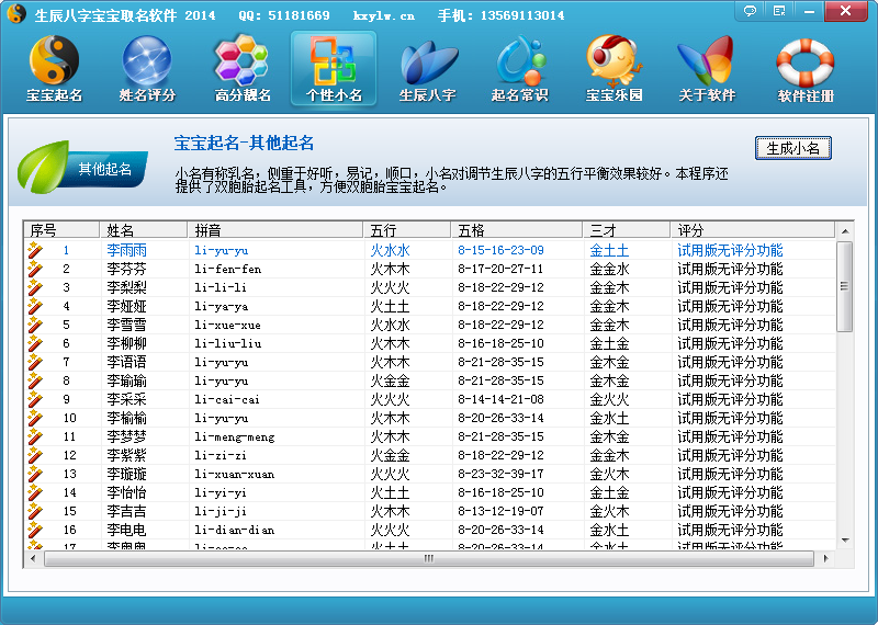 1、 生辰八字宝宝取名软件使用简单,只要你有电脑,安装上本软件你的电脑就会变成一个高分起名专家。通过鼠标简单操作就可以为你的宝宝取一个专业的高分好名。