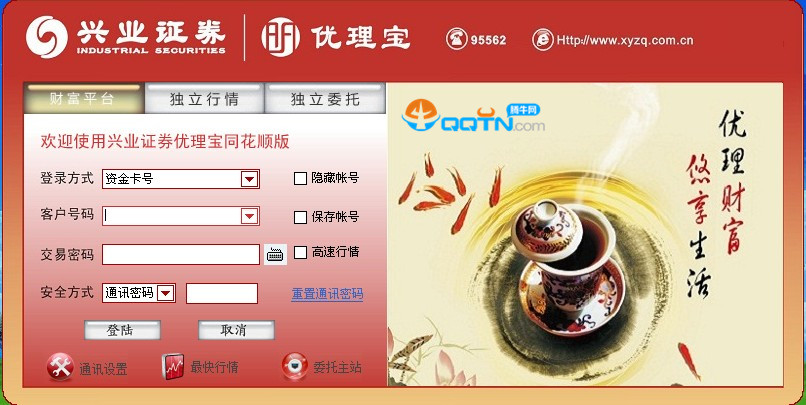 兴业证券优理宝同花顺版(独立委托)是兴业证券推出的证券交易与理财投资软件,兴业证券优理宝同花顺版支持通讯密码和动态口令,安全性能全面提升,切实保障投资者帐户的安全。此外新版的下单程序支持闪电下单、一键撤单、双向委托、提供个性化的下单设置,支持自动成交回报,使得交易更便利,更快捷。客户端通讯密码初始不需要输入。