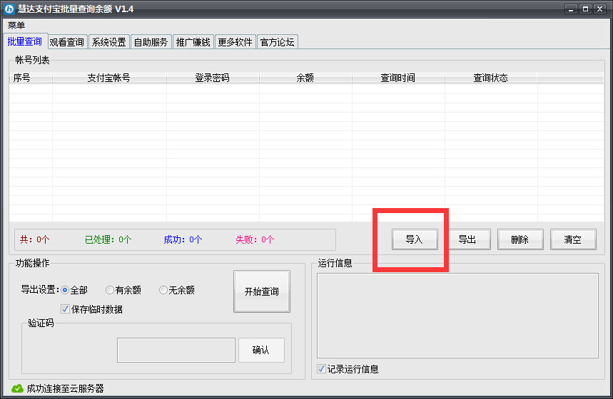 慧达支付宝批量查询余额工具可以用来查询多个支付宝小号账户余额。软件操作完全可视化,可以看到每一个帐号的余额、查询时间、查询状态等。同时软件可以根据查询结果,分类导出保存。