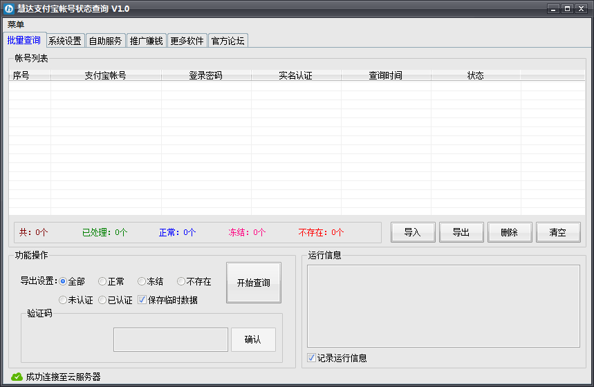 慧达支付宝帐号状态查询软件可以用于批量查询支付宝账号状态,包括是否实名认证、是否存在、冻结、正常。软件多线程运行,支持远程验证码识别,能以最快速查询所有支付宝账号状态信息,免去手工查询的繁琐操作。