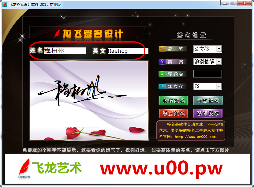 4、软件生成的中文和英文字都是由签名设计师陈继世手工书写后编辑整理形成的软件,软件所生成的全部签名为龙飞签名设计独立完成,无其它电脑字库字。