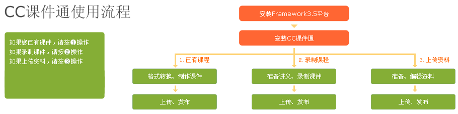 如果您已经有课程,需要将音频转换为MP3,将视频转换为WMV,然后用CC课件通打开转换好的MP3、WMV文件上传发布,在此期间您还可以给音频和视频配上讲义。