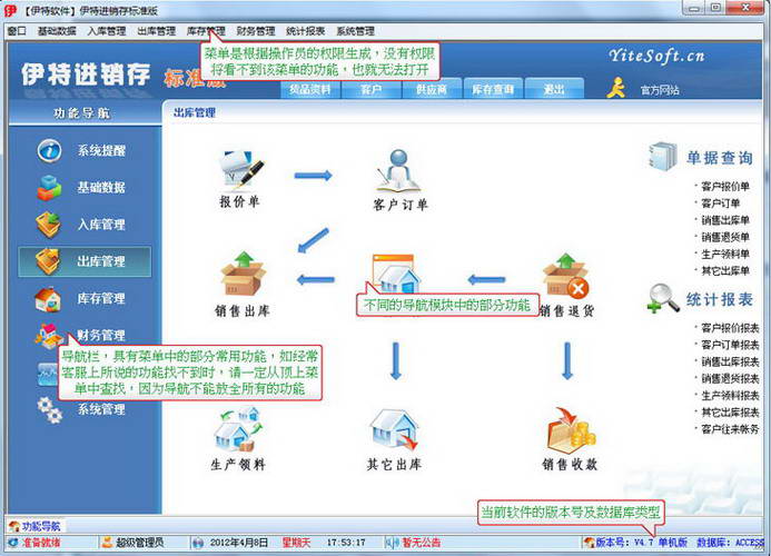 出库管理:销售出货,客户退货,生产领料,销售单据和客户退货查询,客户往来帐务,客户付款。
