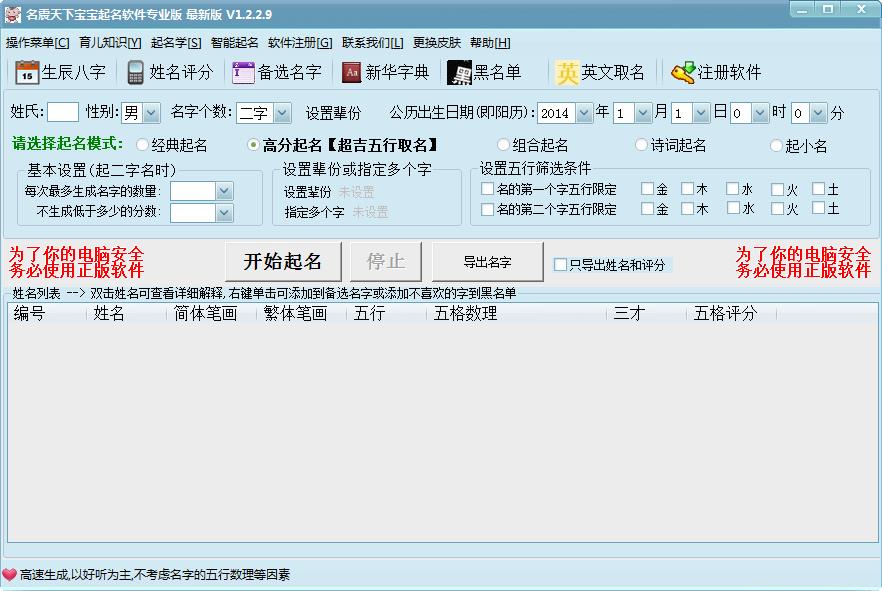 名震天下宝宝起名软件参考大量书籍、文献、字典,采用《五行平衡取名法》结合宝宝姓氏、性别、生辰八字、五格、三才、五行及音行意等重要元素,一次产生数千个好名字!