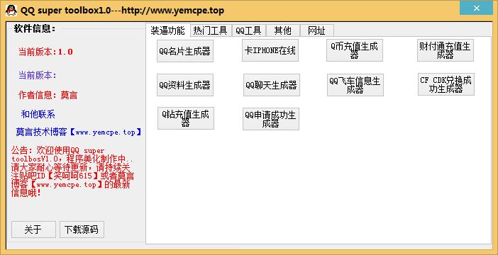QQ超级工具箱(QQ super toolbox)是一款专门为QQ用户制作的一款装逼神器,这款软件可以帮助你瞬间提高逼格,各种伪装截图一键生成,包括QQ名片生成、QQ资料生成、Q币充值生成、财付通充值生成等等,如果你还在需找一款2015年最新的装逼神器,那么这个QQ超级工具箱绝对是个不错的选择!