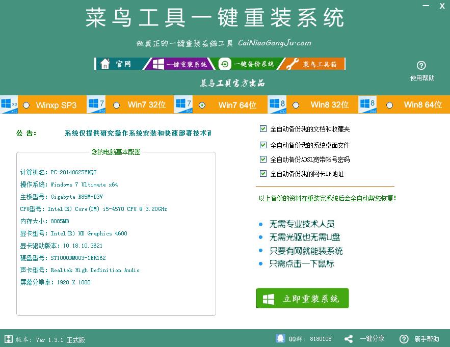 菜鸟工具一键重装系统只针对系统盘操作,确保其它盘符的数据的安全