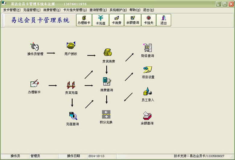新增操作员,操作员授权管理,会员卡解密查询,员工录入,服务项目设置,消费品提成设置,退卡管理,退卡查询。