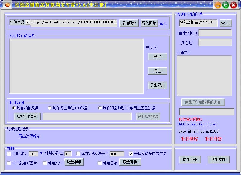 5、本软件区别于其他同类型软件的特点:图片搬家到你的空间可以添加自己的图片水印,制成的CSV数据有自己的店铺类目、所在地、邮费模版,可以说导入的商品完全不用再修改,直接可以上传了。