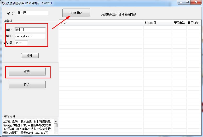 2、登录QQ账号,提取说说,点击“点赞”或“评论”即可