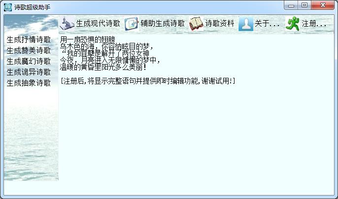 诗歌超级助手是一款绿色小巧的诗歌创作软件,它可以帮助你自动创建诗歌和辅助撰写诗歌,支持自动创建多种风格的现代诗歌,还可以让其辅助你创建诗歌,为你提供美妙的创作思路!是你快速撰写诗歌,研究诗歌的好帮手!