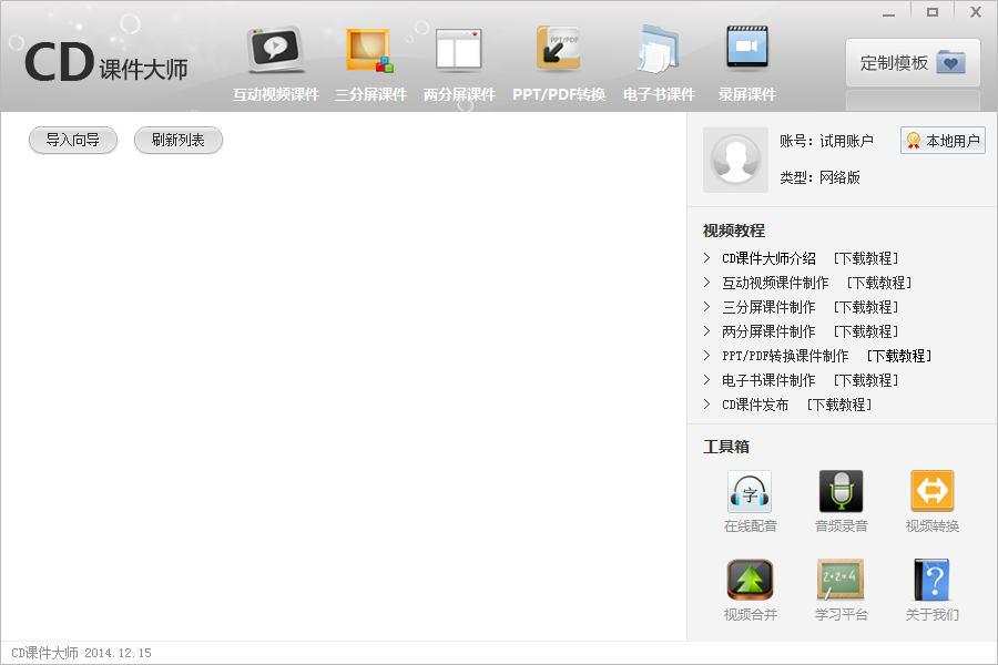 CD课件大师是一款使用范围非常广,广泛应用于宣传、培训、客户服务、市场营销等领域。可开发二分屏、三分屏、互动视频、电子书课件、PPT/PDF转换五种类型的课件,向导式开发,轻松制作课件。