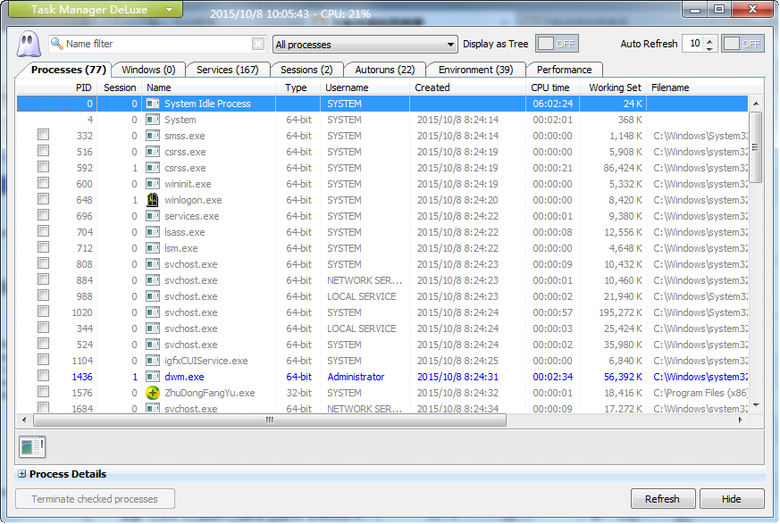 Task Manager DeLuxe (TMX) 是基于 MiTeC System Information 组件套件,提供了Windows任务管理器以及其它强大功能的便携软件。它不需要安装,随处可带。并自动刷新。 会话查看器包含自动会话日志,记录每一个会话登录,注销,锁定和状态的变化。