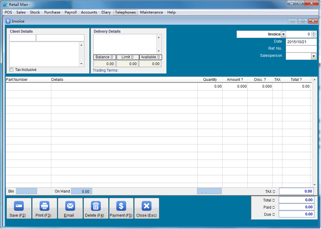 Retail Man 将您的PC变成销售系统与库存控制和会计强大的点 - 没有任何隐藏的附加功能。在POS销售屏幕多币种支持。连接标准的POS机硬件,如文案打印机,条码扫描器,钱箱,顾显,规模和触摸屏来打造一个POS系统与一个或多个POS站。