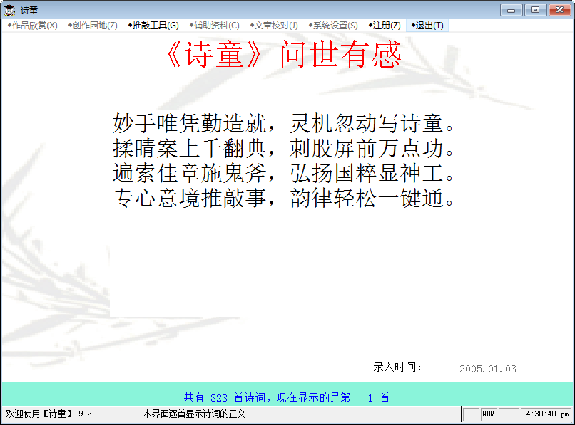 诗童是一款诗词管理软件,特别适合诗词爱好者管理自己的诗词作品、在[诗童]的协助下创作新作品、也可搜集整理自己喜爱的诗词作品。具有诗词作品管理、格律检验、字词句多能宝典、制作电子诗集等功能。可以方便的打印输出或复制到你正在编辑的其他文本中。下载后即可欣赏到软件作者的诗词作品,可以试用格律检验、字词句宝典。如果感觉好用,交费注册后就成为你自己诗词的好管家。