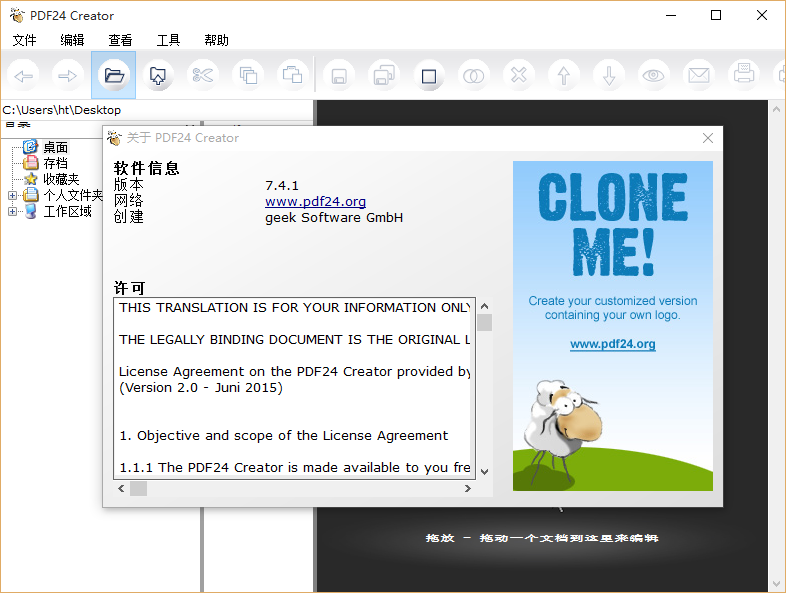 PDF创建工具PDF24 Creator是相当令人惊喜的软件!不仅是有可以将任何档案列印成PDF档的功能(还可以列印为图片),内建的「PDF24 Creator」功能更是强大!完全所见即所得的介面设计概念,把PDF、DOC(Word)、XLS(Excel)或任意档案拖放到软体主介面,居然就可以直接转成PDF档!