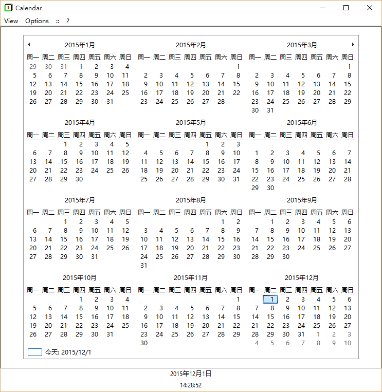 日历工具Calendar 就是一个简单的日历工具。窗口的大小可以显示多达12个月(任何宽度/高度比)。在一个月范围可以转移一步一步来。点击一个月或一年字幕选择任意一个月或一年。