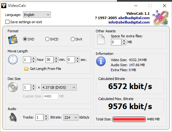 视频比特率计算器VideoCalc是一个免费的应用程序,计算视频比特率时,影片编码到DVD/ SVCD/ DivX的,可安装在指定的光盘大小来使用。支持计算比特率和最大比特率的DVD/ SVCD/ DivX电影。