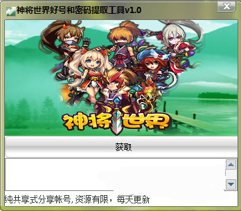 神将世界好号和密码提取工具,是专门为神将世界玩家制作的福利神器,这款软件可以帮助玩家快速批量获取神将世界的好号和密码,分享网友们提供的神将世界账号,让没有体验高级号的玩家们也能感受大神们的世界,免费玩神将世界好号,打你体验一把当大神的感觉!