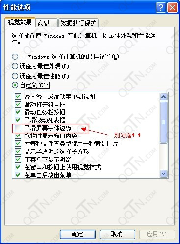 3、将平滑字体边缘去掉。XP:我的电脑->右键->属性->高级->性能设置->点击调整为最佳外观->取消平滑字体屏幕边 缘
