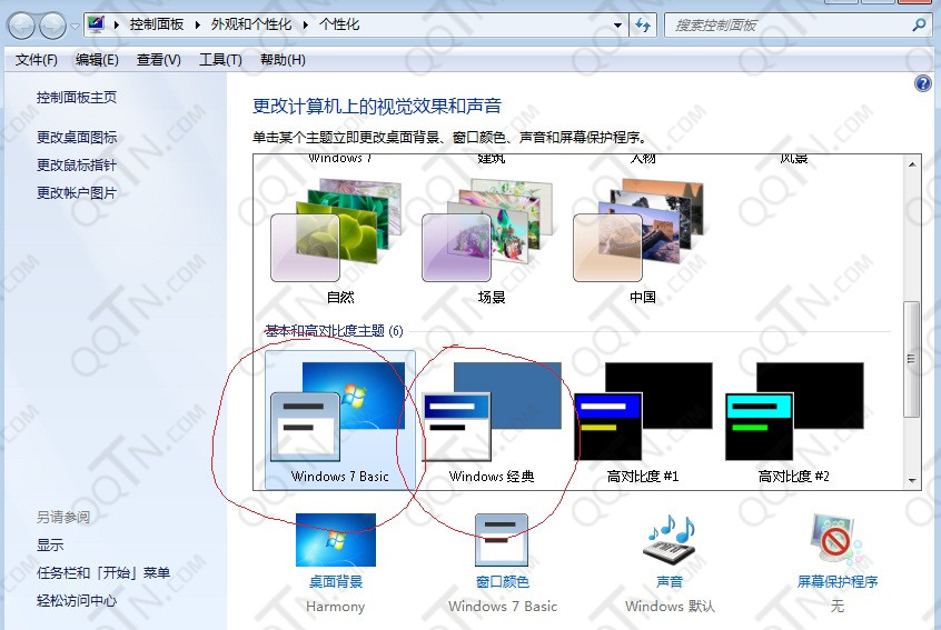 桌面->右键->个性化>Windows7 Basic 或者Windows 经典