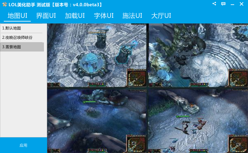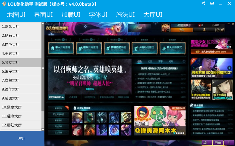 LOL美化助手测试版向玩家免费提供了地图UI、界面UI、加载UI、字体UI、施法UI以及大厅UI修改更换功能,因此版本是beta版,所以功能还将继续完善。