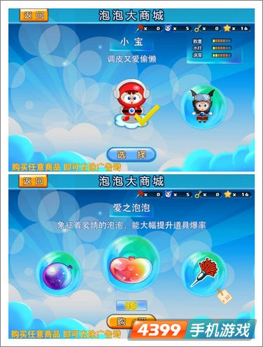 丰富多彩的商店系统,琳琅满目的商品让小编什么都想要。一共三款的人物造型供玩家更换;三种不同颜色不同功能的炸弹为玩家加油助力;针、钥匙、闹钟、礼包等辅助道具在关键时刻都能各显神通,派上用场。