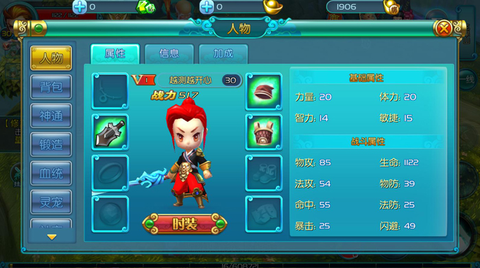 游戏中的战斗属性分为:生命值、暴击率、命中率、闪避率、物理攻击、法术攻击、物理防御、法术防御。