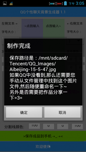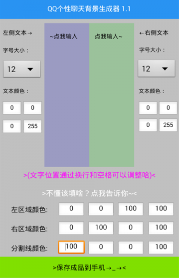 QQ个性聊天背景生成器是一款最近比较流行的一款安卓手机软件,可以用来生成一左一右左右分隔的聊天背景图片,软件使用很简单,只需几步就能亲手DIY出各种个性的QQ聊天背景。让聊天更炫更有个性!赶快来下载制作吧!