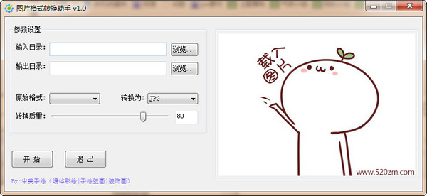 中美手绘(墙体彩绘|手绘壁画|装饰画)出品的图片格式转换助手,与普通转换工具有所不同,转换质量支持任意调节,原本用于墙绘行业墙体彩绘图片素材转换,现拿出来分享,转换速度极快,转换过程实时进度条和图片预览,让您了如指掌,待转换格式支持PC所有支持的图片解码器。如:BMP、JPG、JPEG、PNG、GIF、TIFF、WMF、ICO等。
